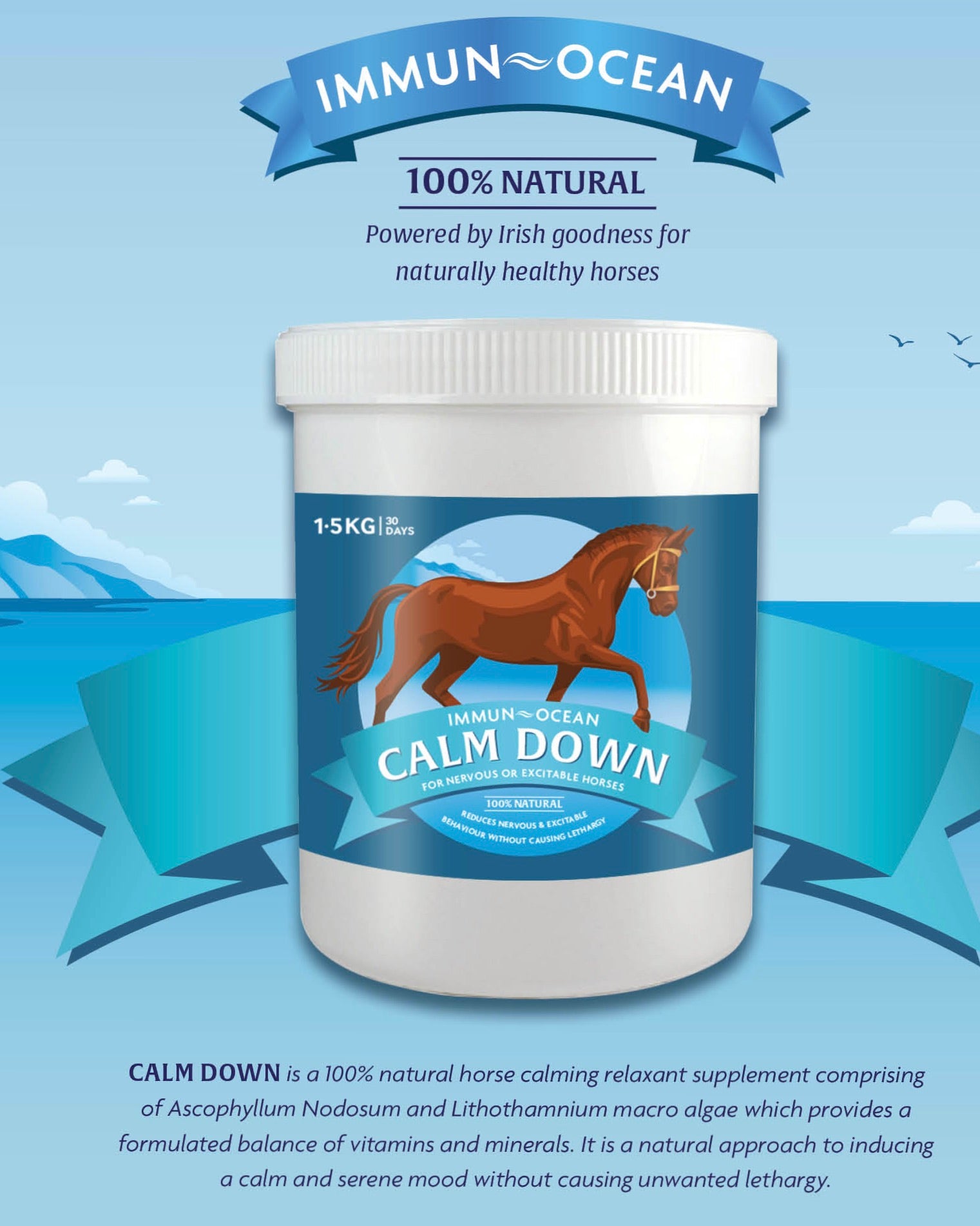 Immun-Ocean CALM DOWN is a daily, 100% natural supplement specifically designed for nervous and excitable horses. Formulated with a balanced blend of Ascophyllum Nodosum and Lithothamnium, it provides essential vitamins and minerals to naturally promote a calm and serene mood, without causing lethargy.