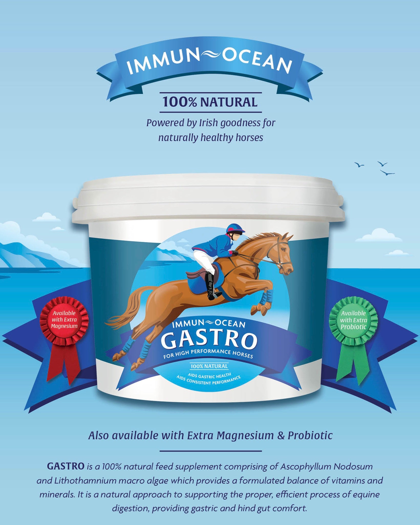 Immun-Ocean GASTRO EXTRA PROBIOTIC is a daily multifactorial, all natural performance supplement expertly formulated to support the digestive health of high performance horses and breeding stock with on going gastric issues. Made from Ascophyllum Nodosum and Lithothamnium, it delivers a perfectly balanced combination of essential vitamins and minerals. This natural blend promotes efficient digestion, ensuring both gastric and hind gut comfort.
